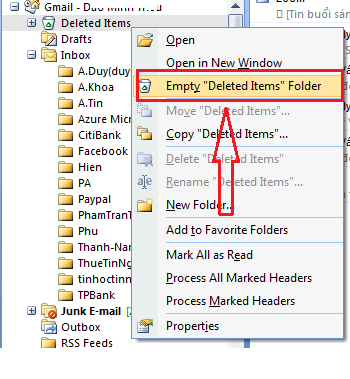 Các bạn đừng vội Empty thùng rác mà hãy để thêm vài ngày sau hẳn xóa luôn mail trong thùng rác này đề phòng trường hợp cần thiết. Thực hiện xóa hẳn mail bằng cách Click chuột phải vào Deleted Items --> chọn Empty "Deleted Items" Folder