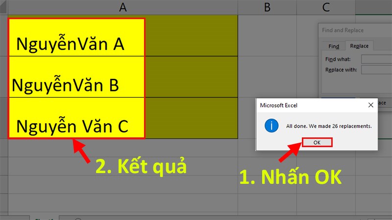 Bước 3: 1 hộp thoại thông báo hiện lên đã thay thế thành công > Nhấn OK để loại bỏ khoảng trắng giữa các từ.
