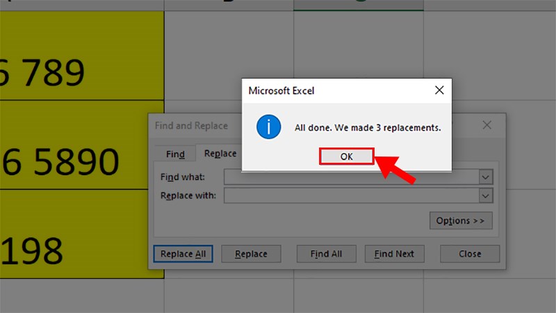 Bước 3: 1 hộp thoại thông báo hiện lên đã thay thế thành công > Nhấn OK để loại bỏ khoảng trắng giữa các chữ số.