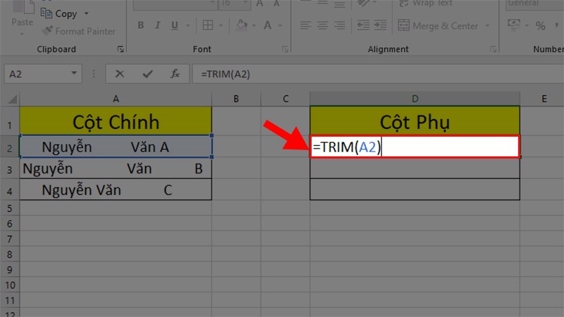 Cách 1. Sử dụng hàm TRIM để loại bỏ khoảng trắng