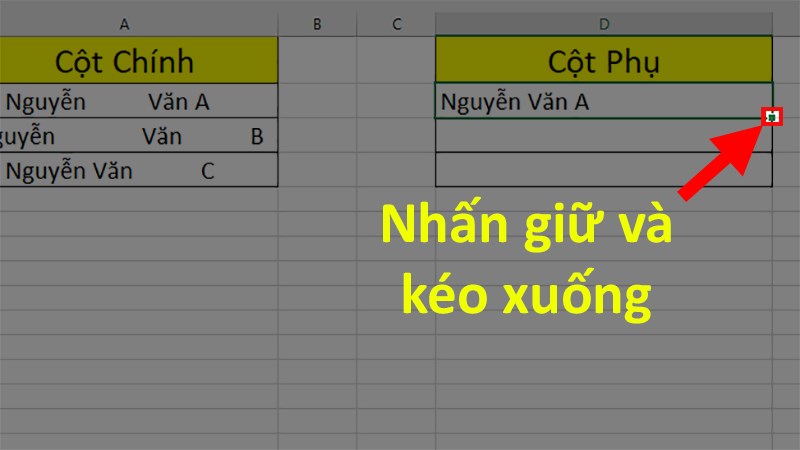 Bước 3: Nhấn giữ ô vuông nhỏ góc phải của ô được chọn > Kéo xuống để áp dụng cho những ô bên dưới.