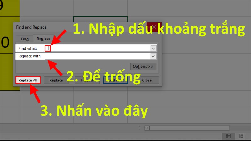 Bước 2: Ở phần Find what nhập dấu khoảng trắng (nút space trên bàn phím) > Ở phần Replace with để trống > Nhấn Replace All.