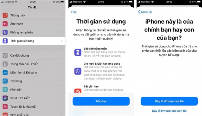 - Bước 1: Bạn vào Cài đặt > Thời gian sử dụng >Tiếp tục. Sau đó làm theo chỉ dẫn nhé.