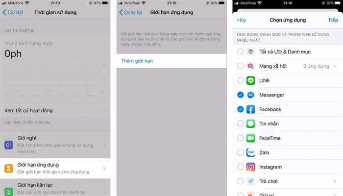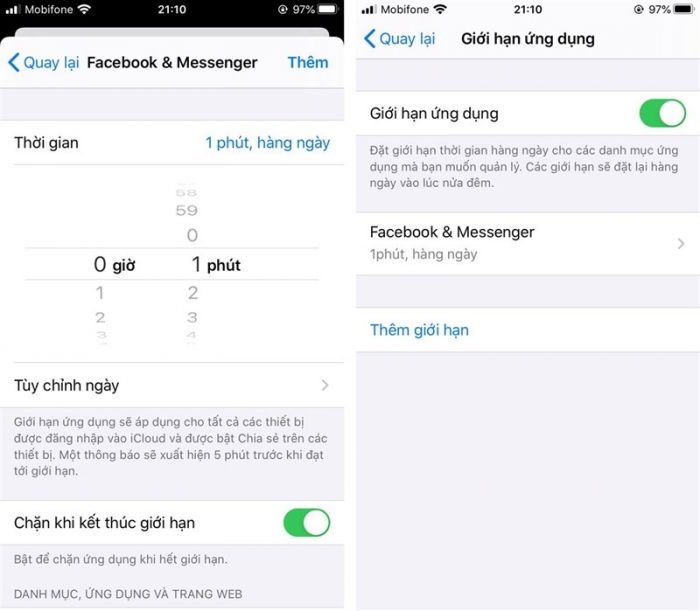 - Bước 4: Những ứng dụng mà bạn vừa chọn sẽ hiện lên, bạn tùy chỉnh thời gian giới hạn, ngắn nhất là 1 phút. Rồi nhấn Thêm là xong.