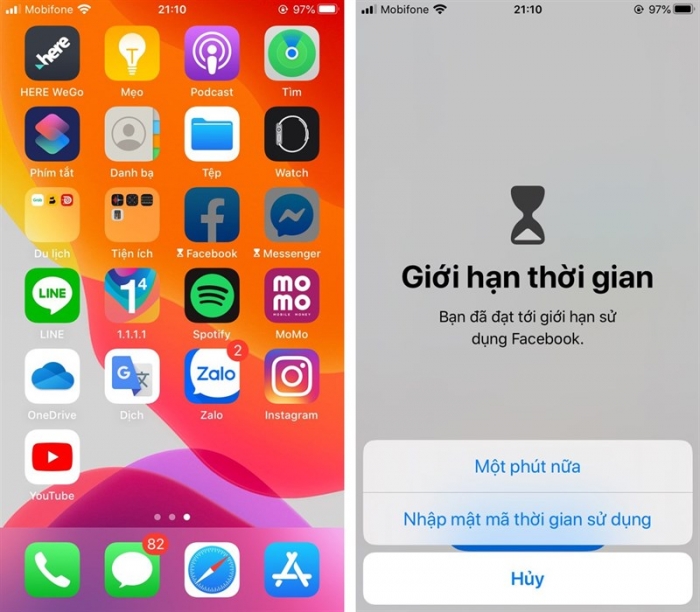Những ứng dụng mà bạn đặt giới hạn sẽ xuất hiện hình đồng hồ cát, biểu thị sự giới hạn. Khi mở những ứng dụng này lên, bạn sẽ phải nhập mật mã để sử dụng tiếp.