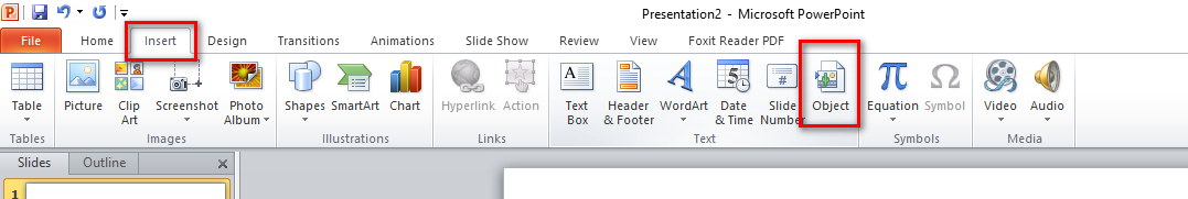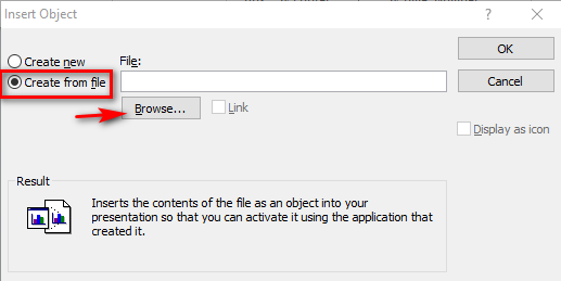 - Bước 2: Trong hộp thoại Insert Object -> Create from file -> Browse…