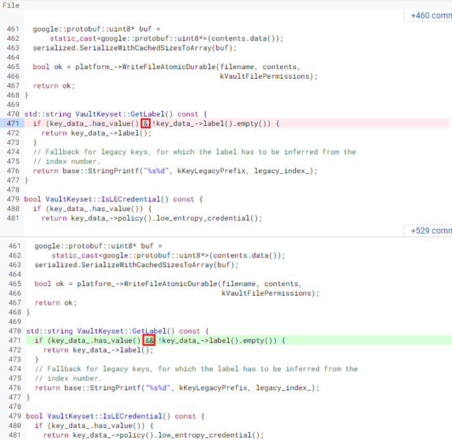 Nhờ đôi mắt "cú vọ" của người dùng Reddit, mọi người đã biết được hóa ra một lỗi chính tả chính là nguyên nhân khiến hàng loạt người dùng Chromebook gặp phải các vấn đề trên. Nếu nhìn vào file này, bạn sẽ thấy các lập trình viên của Google đã quên bổ sung thêm một dấu "&" vào một dòng lệnh điều kiện trong file này. Do vậy, nó ngăn ChromeOS giải mã thông tin đăng nhập của người dùng và làm họ không đăng nhập được.