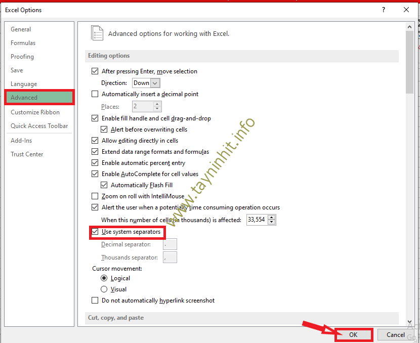 - Bước 3: Trong hộp thoại Options, chọn Advanced --> kéo xuống chọn là Use system separators Để chỉnh sửa chuyển dấu phẩy thành dấu chấm trong Excel chúng ta cần phải tắt phần này đi .