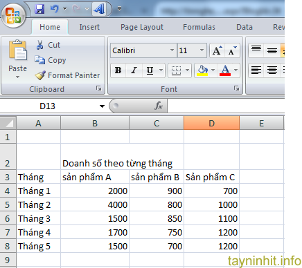 Bảng dữ liệu dưới đây có dữ liệu được biểu diễn theo dạng cột, bây giờ chúng ta sẽ thực hiện các thao tác sau để đưa bảng dữ liệu về dạng biểu diễn theo hàng