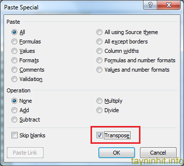 - Bước 3: Cửa sổ Paste Special hiện ra, bạn đánh dấu chọn vào ô Transpose rồi nhấn OK để xác nhận.