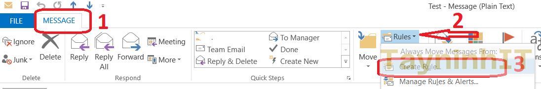 - Bước 2: Ở tab Message, click chọn Rules > Create Rule.