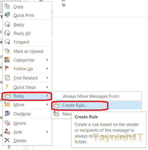 Hoặc với Outlook 2010 và 2007 thì nhấn chuột phải lên email bạn muốn đặt di chuyển tự động đến thư mục cụ thể và chọn Create Rule.