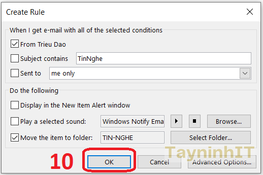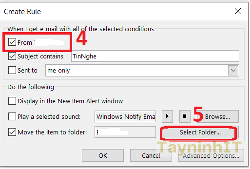 - Bước 3: Trong hộp thoại Create Rule mở ra, bạn tích chọn ô From [Người gửi] và Move the item to folder (Thao tác này sẽ đánh dấu việc từ sau này, các thư được gửi từ [Người gửi] sẽ chuyển trực tiếp vào một thư mục sẽ tạo ở bước sau) > Select Folder