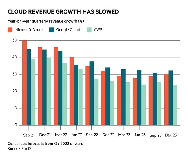 Trước khi sụt giảm, lợi nhuận đến từ nền tảng điện toán đám mây Azure của Microsoft đã có dấu hiệu giảm tốc khi chỉ tăng 42%, thấp hơn dự kiến. Trong khi đó, tỷ lệ tăng trưởng của AWS cũng chỉ đạt 27%, mức tăng thấp nhất kể từ khi Amazon công bố doanh thu của dịch vụ này.