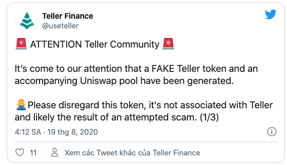 Dự án Teller Finance cảnh báo về token giả mạo hồi tháng 8/2020. Ảnh: TD.