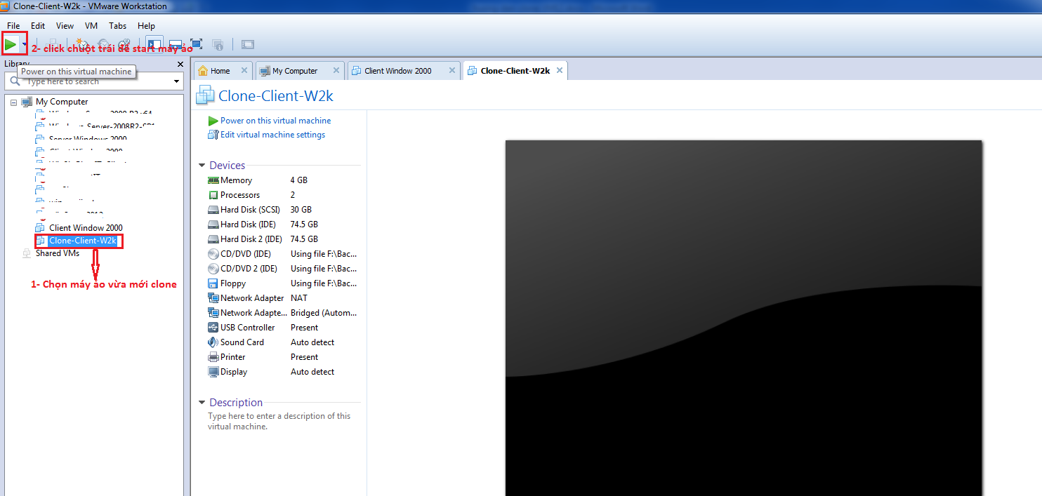 Bước 4: Bật máy ảo mới clone lên để kiểm tra bằng cách nhấp chuột trái để chọn máy ảo cần khởi động --> Chọn nút có hình biểu tượng