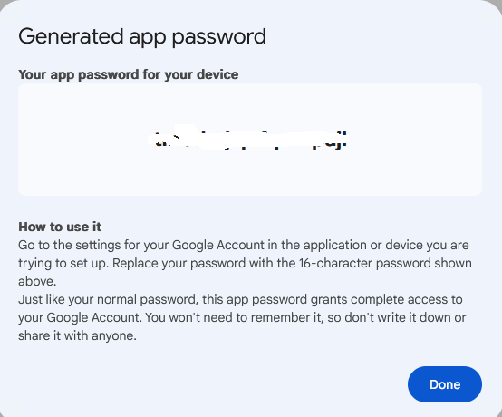 Khi mật khẩu ứng dụng được tạo, bạn cần lưu mật khẩu smtp lại để sau này sử dụng.