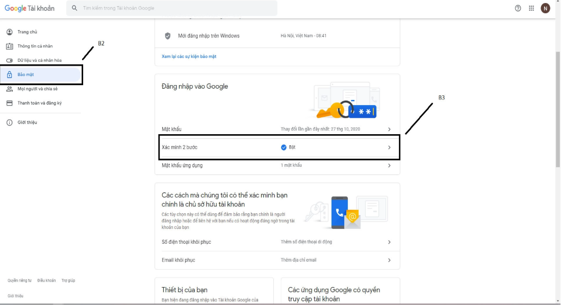 - Bước 2: Truy cập danh mục Bảo mật > Bấm vào dòng Xác minh 2 bước