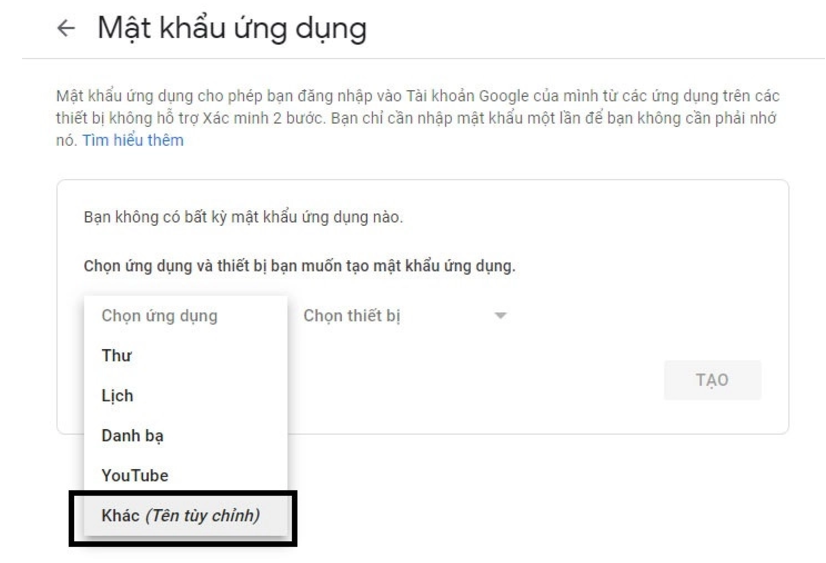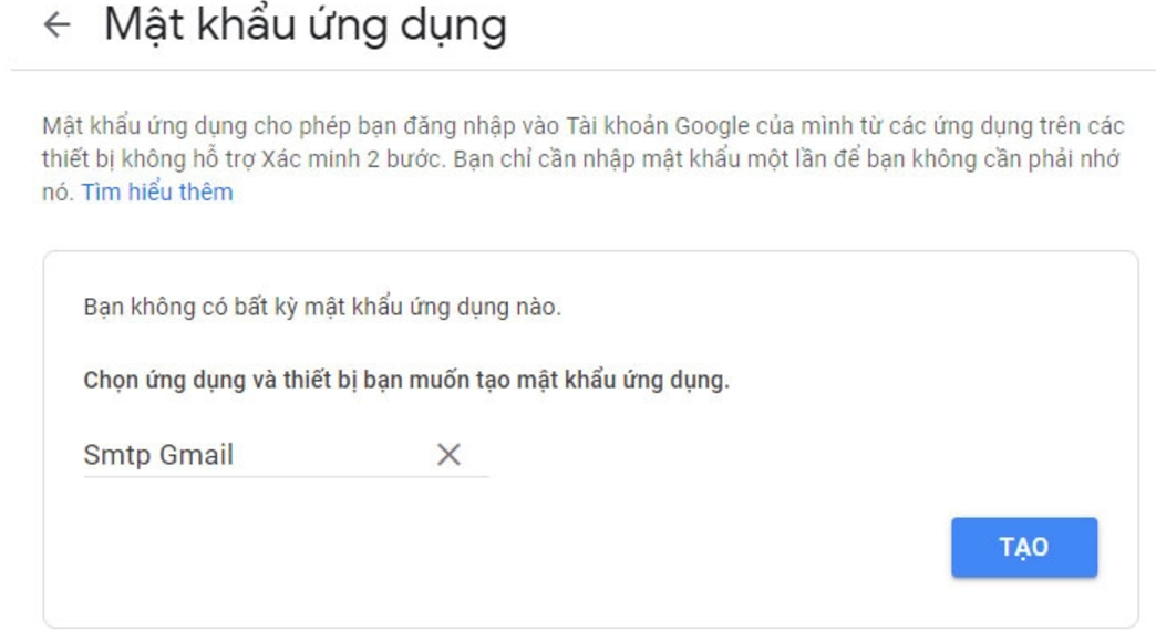 - Bước 3: Sau khi chọn Khác (Tên tùy chỉnh) sẽ hiện ra 1 box để nhập tên. Bạn hãy nhập tên để gợi nhớ cho bạn biết pass này được dùng cho mục đích gì. Ví dụ mình đặt tên là Smtp gmail để sau này biết mật khẩu ứng dụng này dùng cho Smtp gmail. Sau khi nhập xong tên hay ấn Tạo