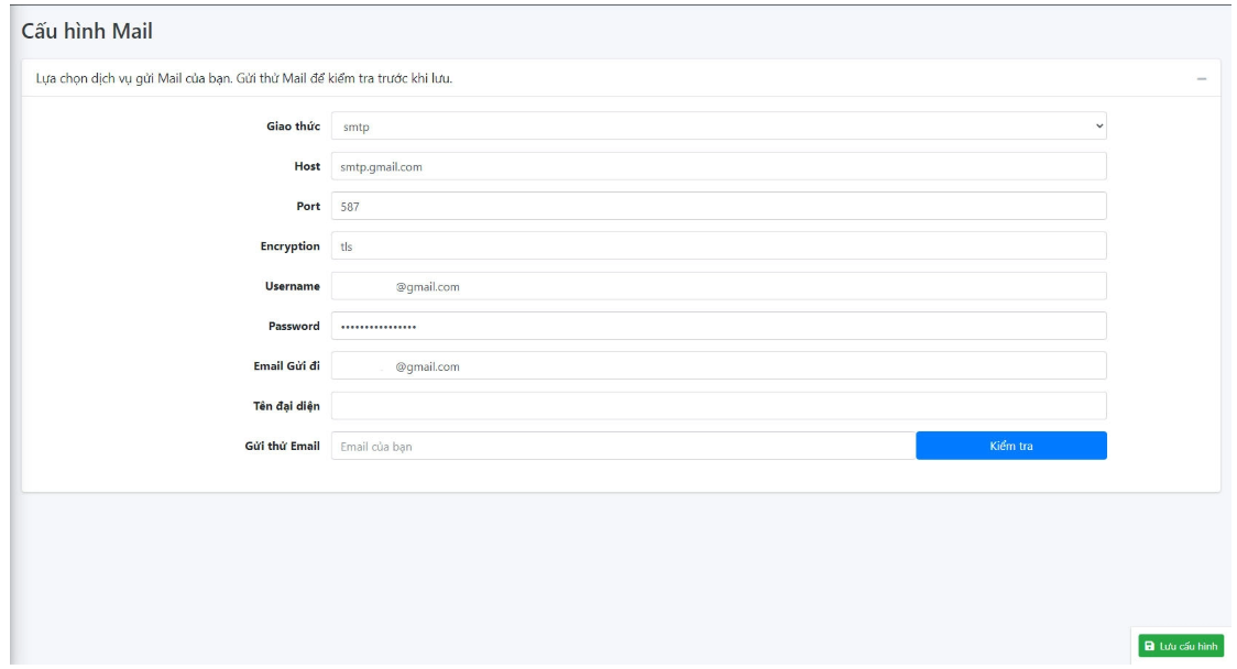 Cuối cùng bạn click để Lưu cấu hình. Sau khi lưu cấu hình, bạn có thể nhập 1 mail của bạn bè hoặc email của ai đó vào để kiểm tra xem bạn đã cấu hình đúng chưa. Nếu hệ thống báo Gửi thành công thì chúc mừng bạn, bạn đã cấu hình thành công rồi nhé.