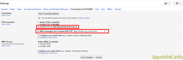 - Vào phần Settings -> Forwarding and POP/IMAP và thiệt lập các tùy chọn như hình sau: