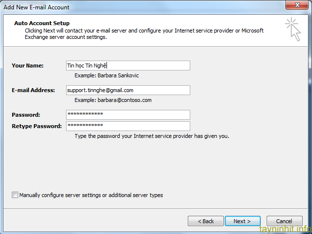 Nhập vào toàn bộ thông tin về tài khoản Gmail của bạn (chú ý là không kích vào nút chọn phần Manually configure server settings or additional server types). Click vào Next sau khi đã khai báo xong thông tin.