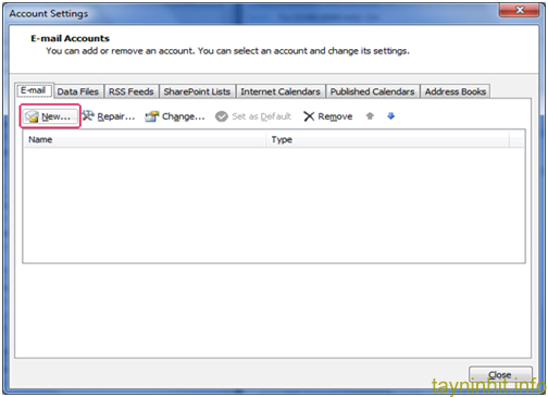 Trong phần Account Settings chọn tab E-mail và kích vào New…