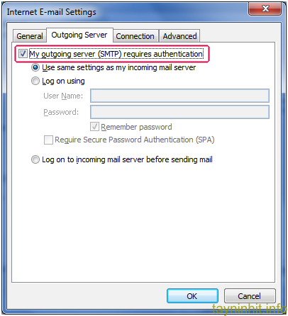 Tiếp tục kích vào nút More Settings…, chuyển sang tab Outgoing Server và tích chọn vào phần My outgoing server requires authentication