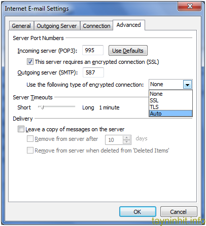 - Thay đổi phần Use the following type of encrypted connection thành Auto hoặc sử dụng TLS nếu vẫn có vấn đề xảy ra.