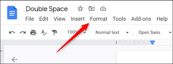 - Bước 1: Trước tiên, hãy mở tệp Google Docs đã được áp dụng định dạng giãn dòng đôi >> “Format” (Định dạng) trong thanh menu.