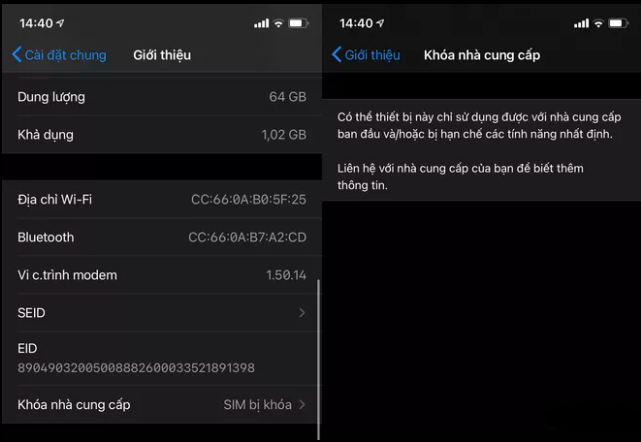 - Nếu có dòng chữ "SIM bị khoá" kèm theo thông báo "Có thể thiết bị này chỉ sử dụng được với nhà cung cấp ban đầu và/hoặc bị hạn chế các tính năng nhất định" thì đồng nghĩa với việc đó là một chiếc iPhone Lock.