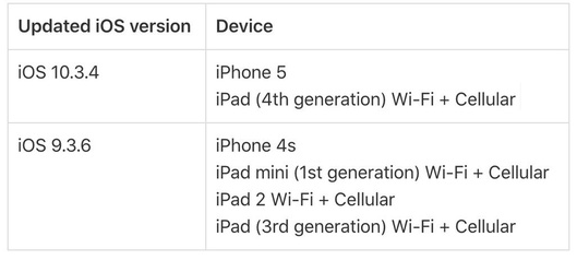 Cụ thể, iPhone 4s, iPad 2, iPad 3 và iPad mini thế hệ đầu tiên đã nhận được bản cập nhật iOS 9.3.6. Trong khi đó, iPhone 5 và iPad 4 nhận được bản cập nhật iOS 10.3.4. Lưu ý đối với iPad, chỉ các model hỗ trợ 3G/4G mới nhận được bản cập nhật này, còn các model Wi-Fi thì không.