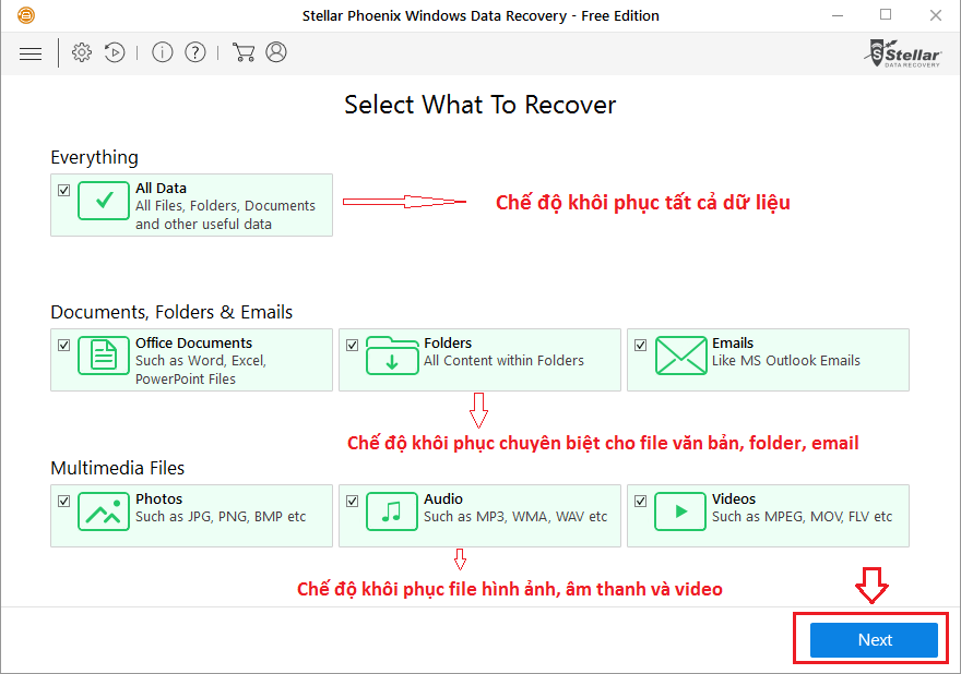 - Multimedia Files: Chế độ khôi phục file hình ảnh, âm thanh và video.
