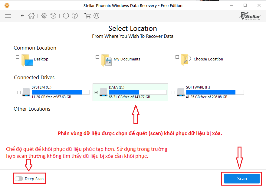 Bước 4: Tiếp tục lựa chọn nơi chứa dữ liệu đã bị xóa. Ở đây bạn có thể chọn theo phân vùng hoặc theo folder, sau đó bấm Scan. Phần mềm cung cấp cho người dùng 2 chế độ quét tài liệu khác nhau, với lựa chọn thông thường giúp tìm kiếm và khôi phục tất cả các trường hợp bị mất dữ liệu, còn lựa chọn Deep Scan sẽ giúp bạn thực hiện các tiến trình khôi phục dữ liệu phức tạp hơn.