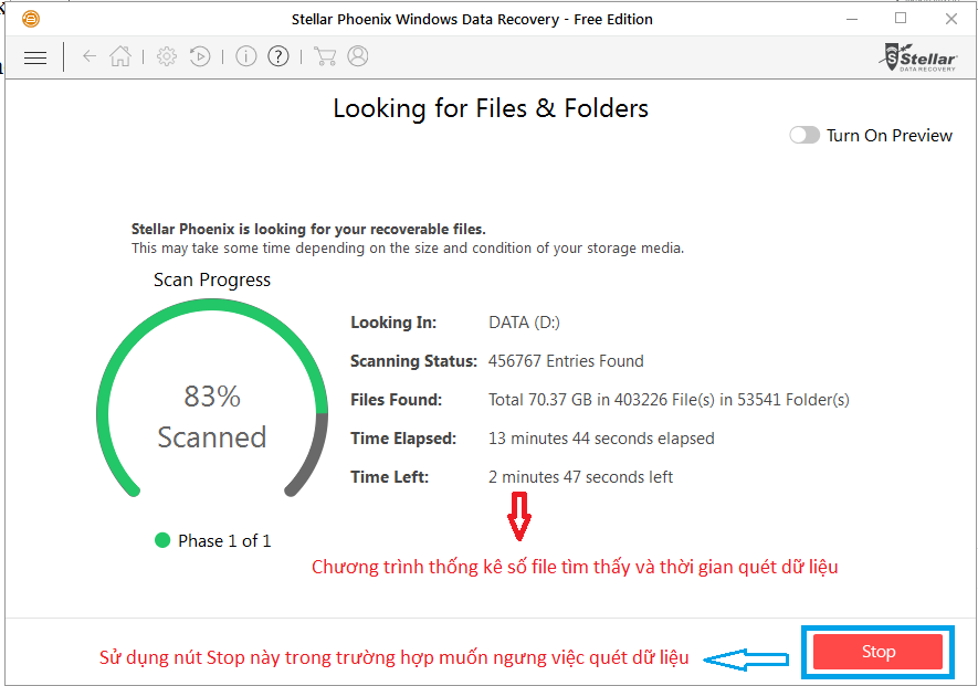 Bước 5: Chương trình sẽ thống kê số lượng file đã được tìm thấy, thời gian quét cũng được hiển thị chi tiết. Bạn cũng có thể xem trước dữ liệu nếu sử dụng tùy chọn Turn On Preview.