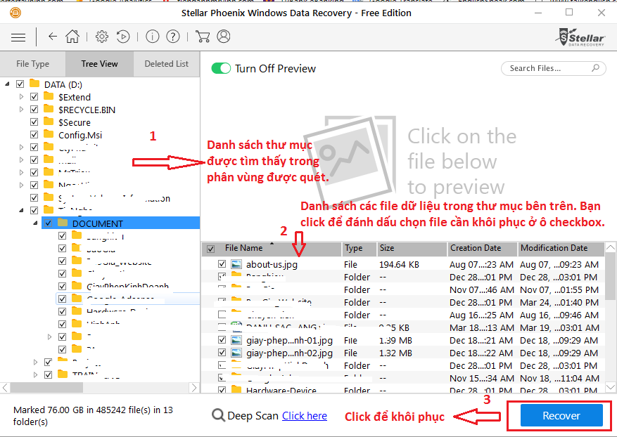 Bước 6: Sau khi chương trình thực hiện quét xong ở bước 5 thì sẽ hiện ra danh sách các file và folder trong phân vùng. Dữ liệu được sắp xếp theo cấu trúc dạng cây, do đó bạn có thể dễ dàng tiếp cận dữ liệu và phục hồi dữ liệu của mình.