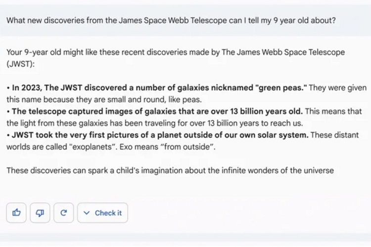 Bard, chatbot AI của Google cạnh tranh trực tiếp với ChatGPT, đã khiến công ty chủ quản bay hơi 140 tỷ USD giá trị thị trường dù chưa ra mắt với câu hỏi có nội dung“Tôi có thể nói với đứa con 9 tuổi của mình về những khám phá mới nào của kính thiên văn James Webb?”.
