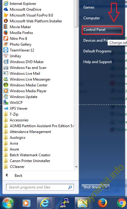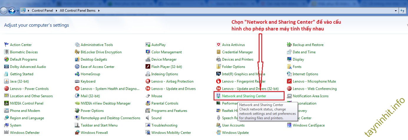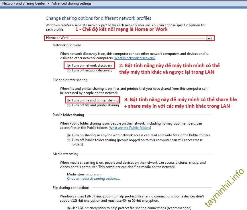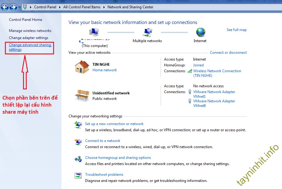Bước 1: Tiến hành turn on Network Discovery và File Sharing bằng cách Start -> Control Panel -> Network and sharing center -> Change Advanced Sharing Settings