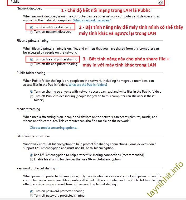 - Trường hợp 2: Máy tính kết nối mạng LAN ở dạng "Public" thì bạn chọn thiết lập như hình bên dưới, sau đó click "Saves change" để lưu lại thay đổi cấu hình.