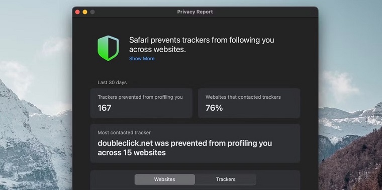 Bảo vệ quyền riêng tư. Apple luôn thể hiện là một công ty coi trọng quyền riêng tư của người dùng. Họ sử dụng nhiều giải pháp khác nhau, cả phần cứng lẫn phần mềm, để bảo đảm an toàn. Trình duyệt Safari có tính năng Privacy Report, thông báo đến người dùng về việc trình duyệt ngăn các trang web theo dõi họ. Privacy Report cũng thống kê chi tiết tỷ lệ các trang web muốn lấy thông tin về hoạt động của người dùng. Ảnh: Makeuseof.