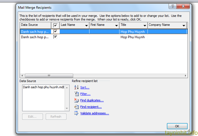 Sau đó, tại cửa sổ Mail Merge Recipients, chọn OK