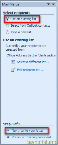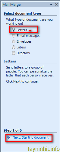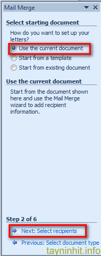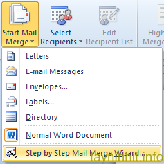 Chọn thẻ Mailing > Start Mail Merge > Step by Step Mail Merge Wizard