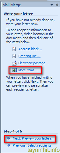Chọn More items, xuất hiện bảng Insert Merge Field, ta chọn Insert vào các mục đã thiết kế, cuối cùng sau khi đã Insert vào vị trí đúng, chọn Next: Preview your letters, ví dụ như sau: