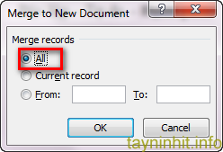 Tại thẻ Mailing > Finish & Merge > Edit Individual Documents > xuất hiện cửa sổ Merge to New Document > All > OK