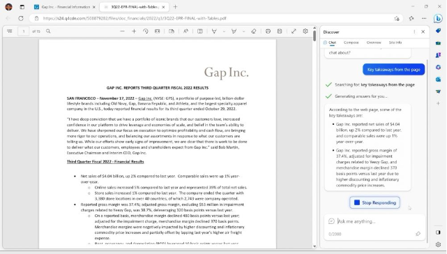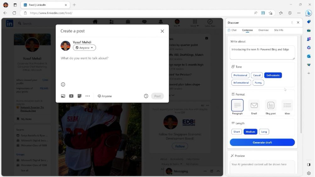 Điểm thú vị của "chat" là bạn có thể tóm lược nội dung trang web hoặc tài liệu đang xem và đặt câu hỏi về nội dung của nó, trong khi tính năng "soạn thảo" giống như một trợ lý viết lách cho người dùng, giúp tạo ra các đoạn văn bản như email, bài đăng mạng xã hội, … chỉ dựa vào một vài gợi ý.