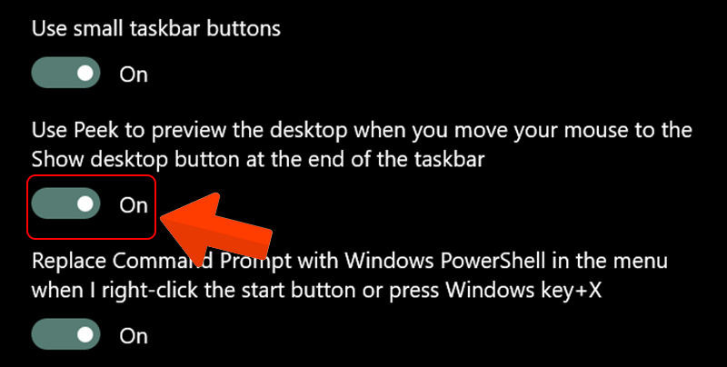 + Bước 2: Trong mục "Use Peek to preview the desktop when you move your mouse to the Show desktop button at the end of the taskbar", gạt nút sang phải để bật.