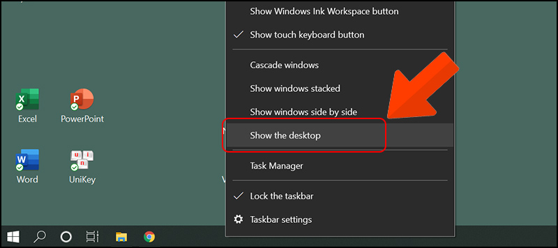 Nhấn chuột phải lên thanh Taskbar > Chọn Show the desktop.