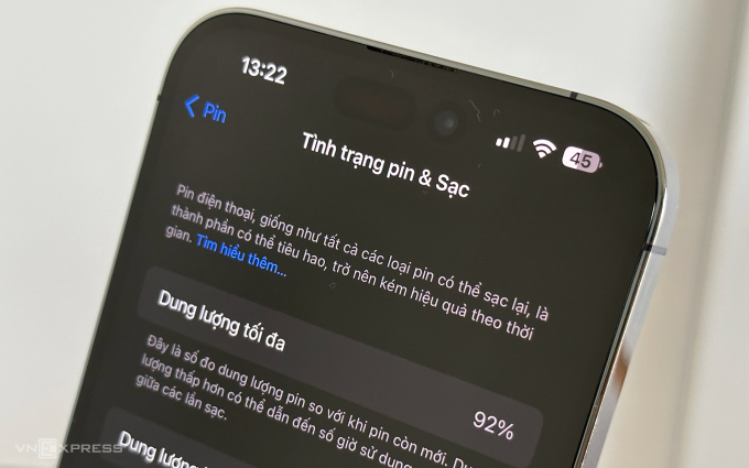 Dung lượng pin trên chiếc iPhone 14 Pro Max chỉ còn 92% sau 10 tháng sử dụng. Ảnh: Ngọc Trung