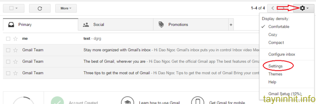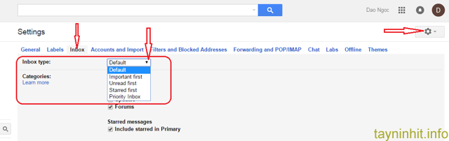 Thông thường các Email trong Gmail sẽ được sắp xếp theo thứ tự ưu tiên theo thời gian, những Email được gửi gần nhất sẽ đứng ở top đầu. Bạn có thể thay đổi cách sắp xếp này như sau, bạn vào Settings -->Inbox. Sau đó click vào mũi tên xổ xuống ở mục inbox type và tùy chọn một trong 4 cách sắp xếp