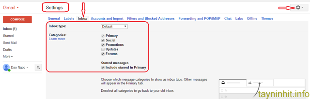 Gmail đã được tích hợp cho phép bạn sử dụng giao diện tab trong hộp thư đến gồm những tab: Primary (Quan trọng); Social (mạng xã hội); Promotions (Quảng cáo); Forum (diễn đàn) tương ứng với các Email được gửi đến. Ngoài ra bạn có thể tùy biến các tab này trong mục Settings.